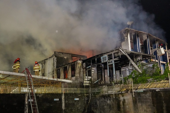 Brandweermannen klommen op daken van gebouwen om de brand te blussen
